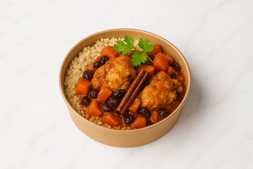 Un plat oriental sucré-salé, où le poulet mijoté, les oignons,