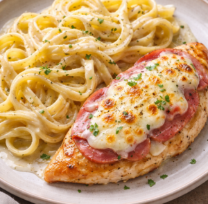 Filet de poulet cuit au four recouvert de provolone et tranche de poulet fumé le tout accompagné de tagliatelles