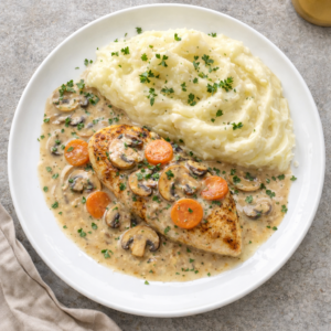 Purée de pommes de terre au cumin, filet de poulet, sauce roquefort aux champignons frais, rondelles de carottes