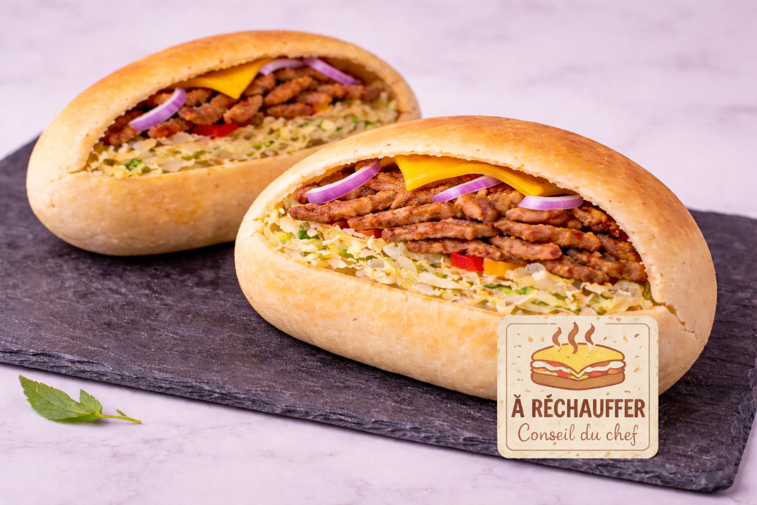 🔥 À RÉCHAUFFER , pain moelleux farci, cheddar, oignons rouges, tomates,